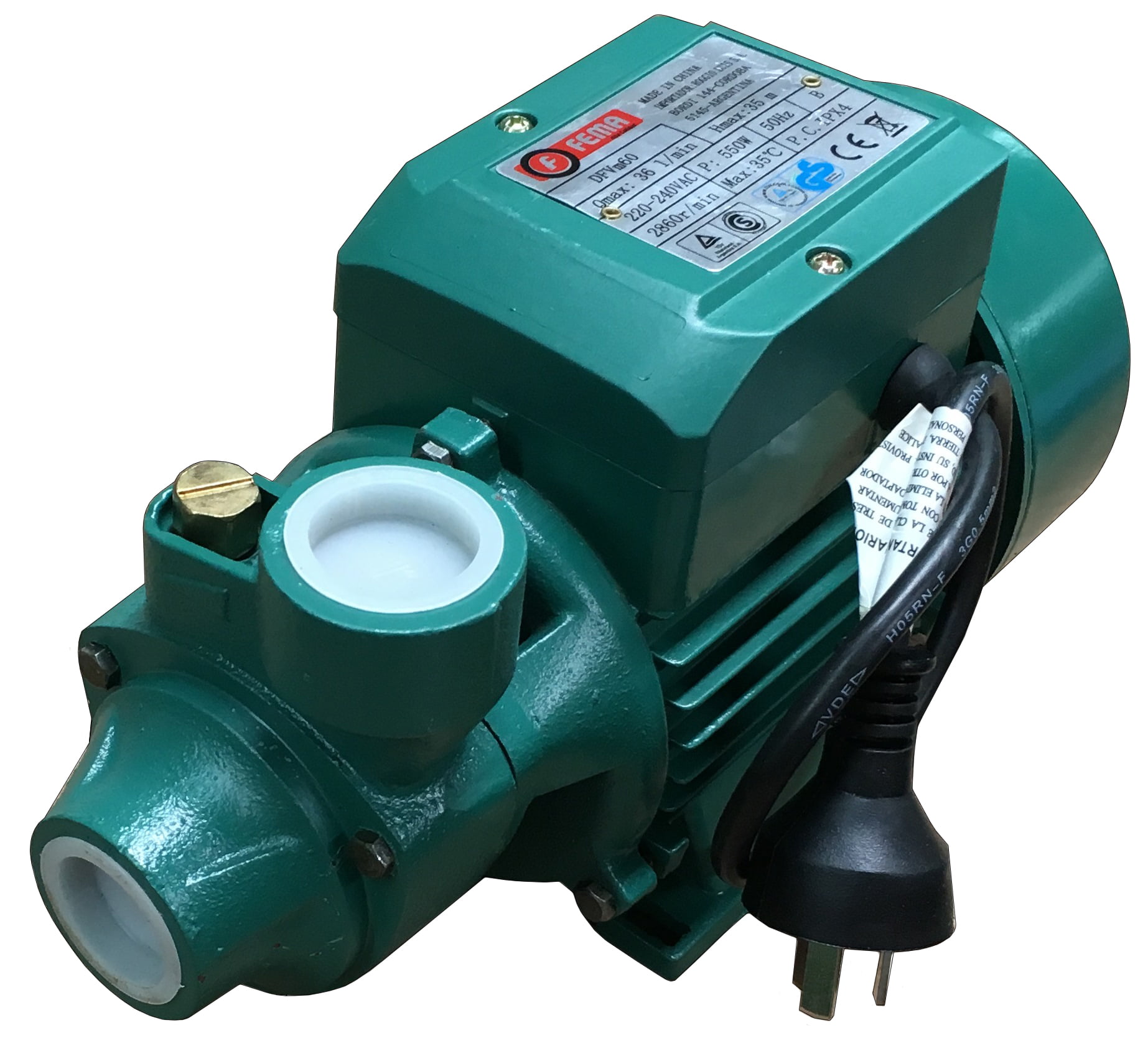 Electrobomba Centrifuga *Marca FEMA *Modelo DFVM60 *0,37 KW *0,5 HP *220 VOLTS *Altura Máx. 10 – 30 Metros *36 L/Min *Tamaño: 1» x 1» *5,5 Kg *Turbina de bronce