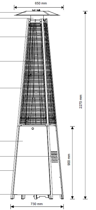 Calefactor para exteriores a gas envasado. Para garrafa de 10 kg, no incluye regulador. Con tubo central de vidrio y ruedas para transporte. Color negro. Salida de calor regulable. 46300 BTU. 28 KG. 0.4-0.9Kg/Hs . Encendido Pozi.