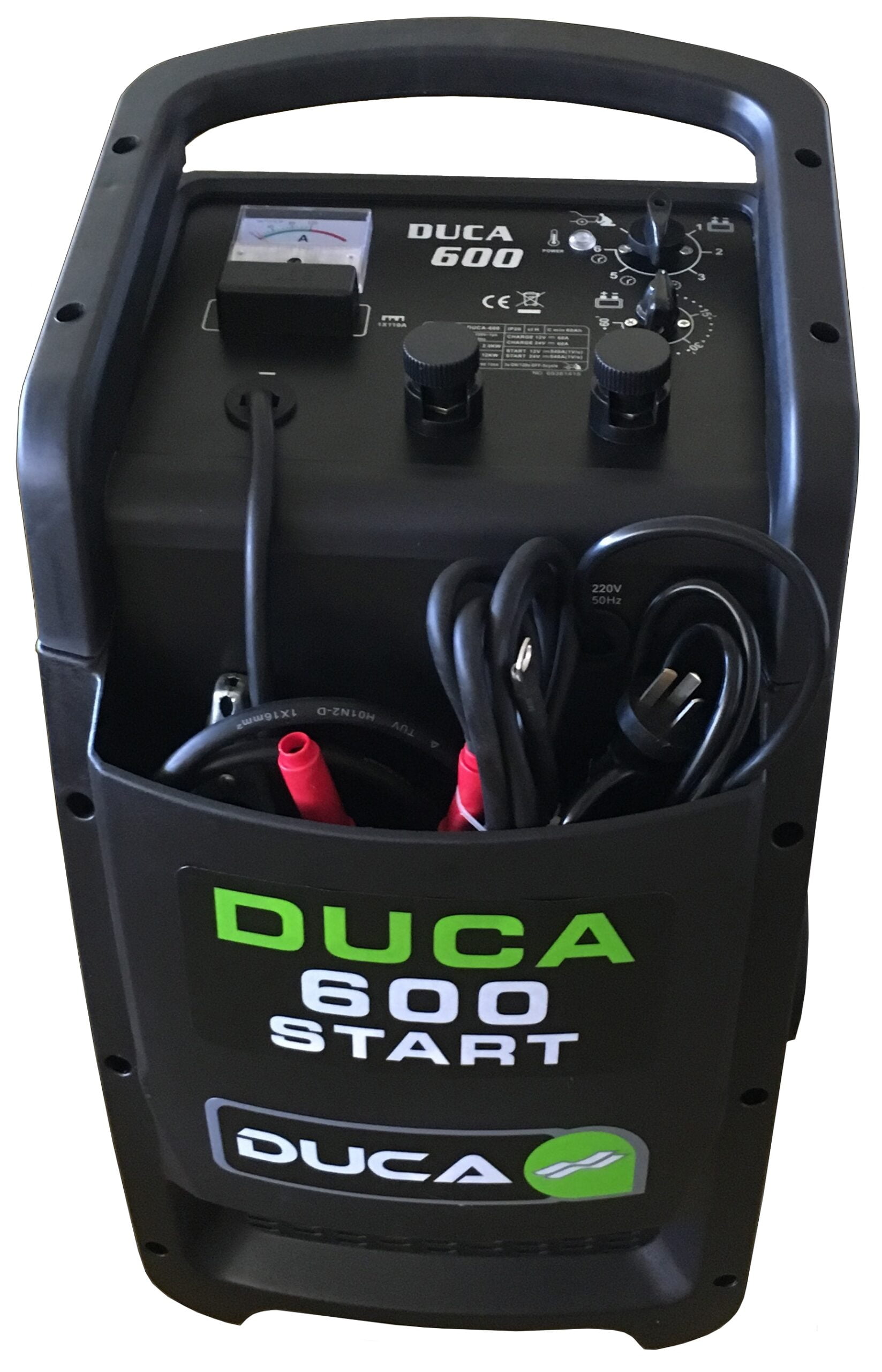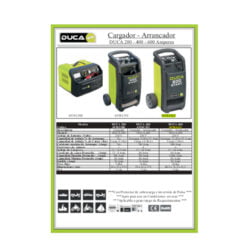 Cargador – Arrancador *Modelo: DUCA 600 *Voltaje de Entrada (Volts): 230 V *Capacidad de trabajo % de Arranque: Arranque 12 (Kw)55 Amp *Capacidad de trabajo % de Carga (Kw): Carga 2 (Kw) *Corriente maxima de Arranque (Amp): 540 Amp *Posiciones de Ajunste: 6 *Voltaje de Carga (v): 12 / 24 Volts *Corriente de carga Promedio (Amp): 60 Amp *Capacidad Maxima Promedio (Amp): 1.000 Amp *Capacidad Minima Promedio (Amp): 60 Amp *Fusible (Amp): 20 Amp *Peso (Kg): 26 Kg *Dimensiones (cm): 40.5 x 31.5 x 61.5