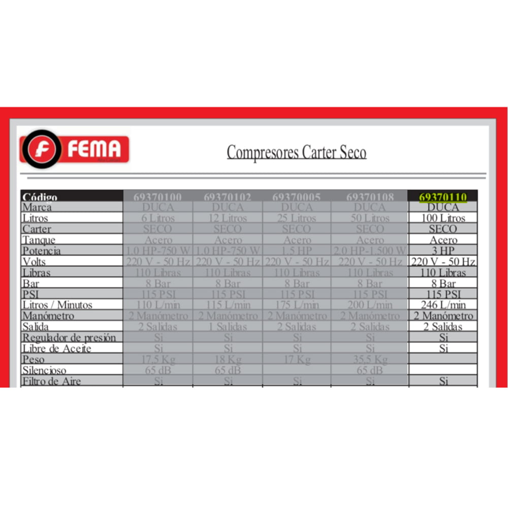 COMPRESOR DUCA 3HP-100 LITROS- CARTER SECO- 220V- 110 LIBRAS- 8 BAR- 115 PSI- 246 L/Min- 2 Manometros y 2 salidas de aire,