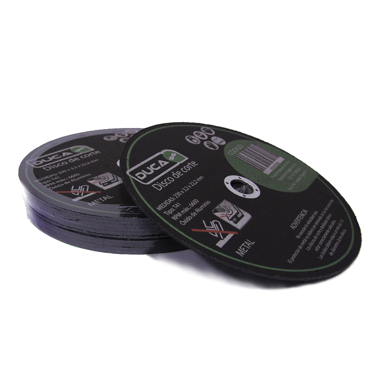 Disco Corte Duca: *Tipo:T41 *Para Metal *Dimensiones: 230×2,0x22,2 *Composicion: Oxido Aluminio Blanco *Caja 25 Unidades