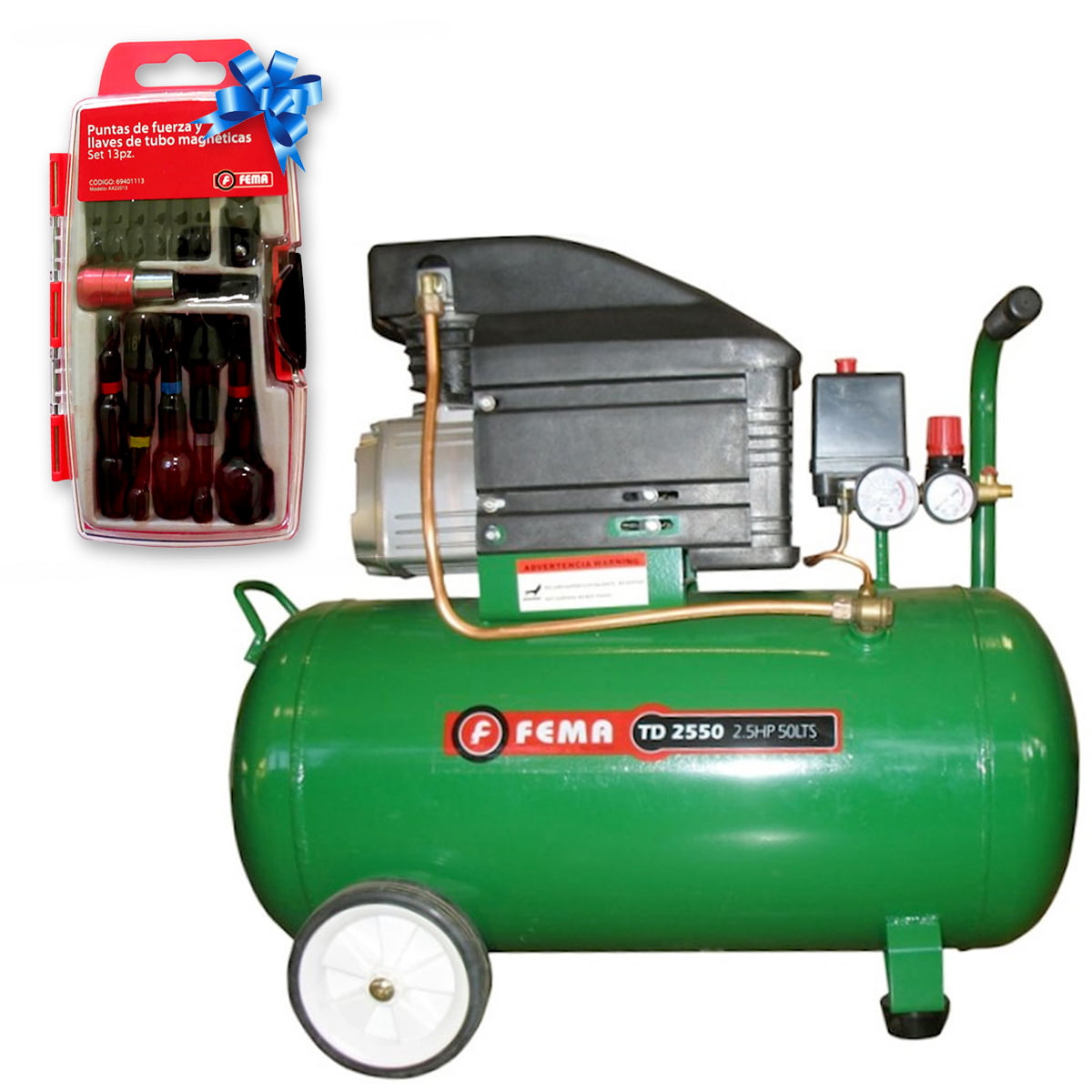 Compresor FEMA 2.5 HP Con Tanque De 50 Litros Y Ruedas, 220V . De regalo: Set Puntas De Fuerza Y Llaves Tubo Magneticas Fema 13 Piezas Código: 69401113
