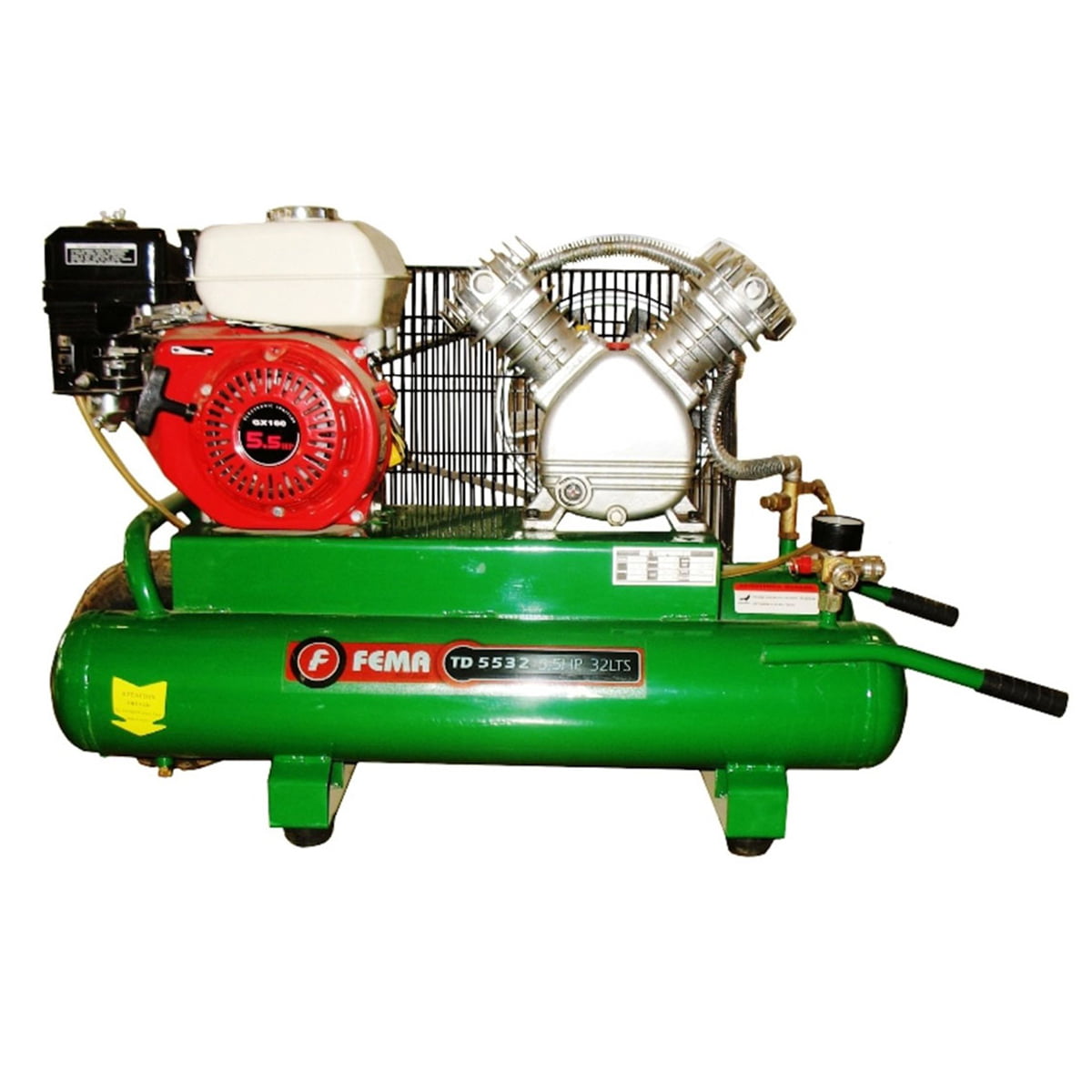 Compresor a Explosion *Marca: FEMA *Modelo: FEMA 5532 *HP: 5.5 HP – OHV – 4 Tiempos *Tanque Litros: 32 Litros *Manómetro: Dos Manómetros *Salida de Aire: 2 Salidas de Aire – Válvula esférica con regulador *Corte: Corte Automático por desaceleración de motor *Baja-Baja: SI *Nº Cilindros: V2 *L/Min: 360 Litros / Minutos *BAR: 8 BAR