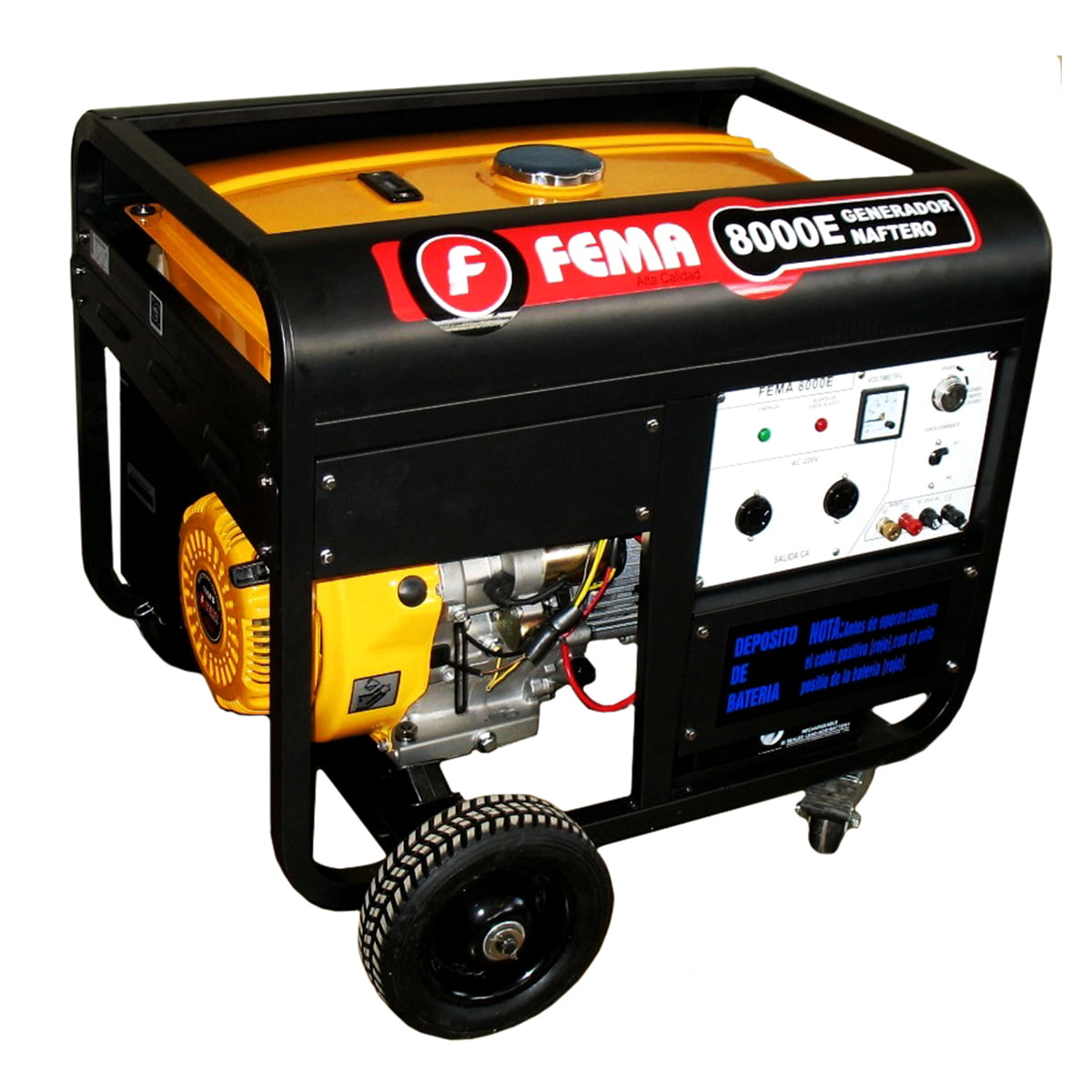 Generador Eléctrico Trifásico Fema: *Modelo: Fema 8000 *Potencia: 16 Hp *Motor Fema *Watts: 6500W *Kva: 8 *Fase: 220/380v *Factor Potencia: 0.8 *Avr: Si *Arranque Electrico *Transferencia: No *Bateria: Si *Tanque: 25Lts *Panel: Analogico *Autonomia: 13Hs *Cabina: Abierto *Medidas: 790 x 540 x 600 *Peso: 81Kg *Salida Alternativa: 12 Volts